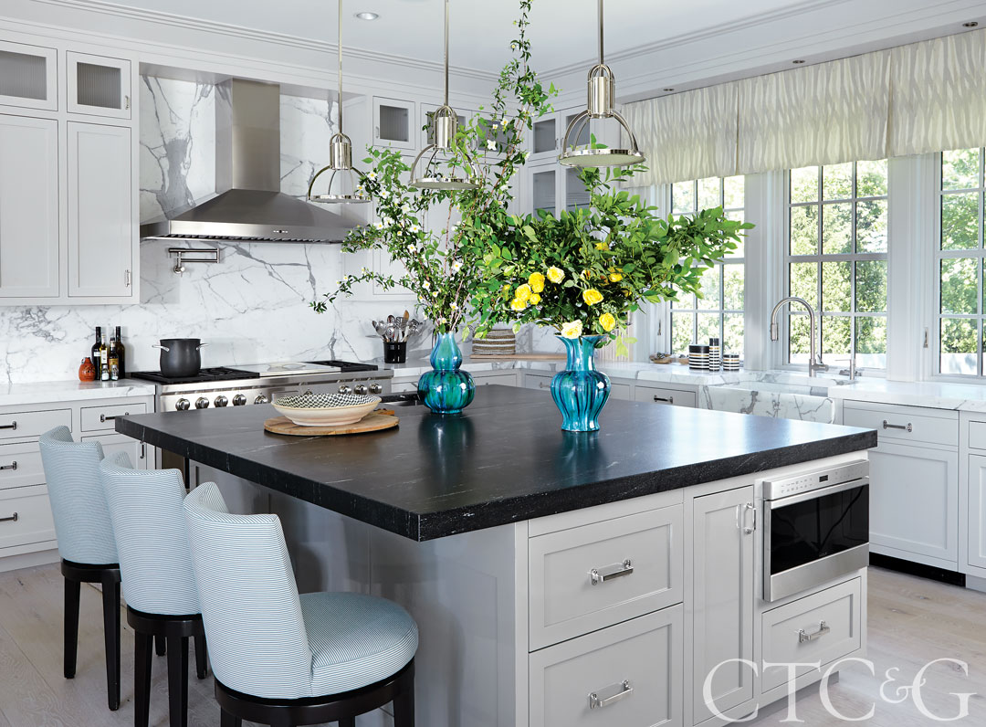 Holly Hunt Corona pendants hang above the kitchen island. The floral arrangements throughout are from Botanica Floral Studio. A. Rudin counter stools wear a Perennials fabric. Valance is crafted from Christopher Farr Cloth linen from Holland & Sherry.