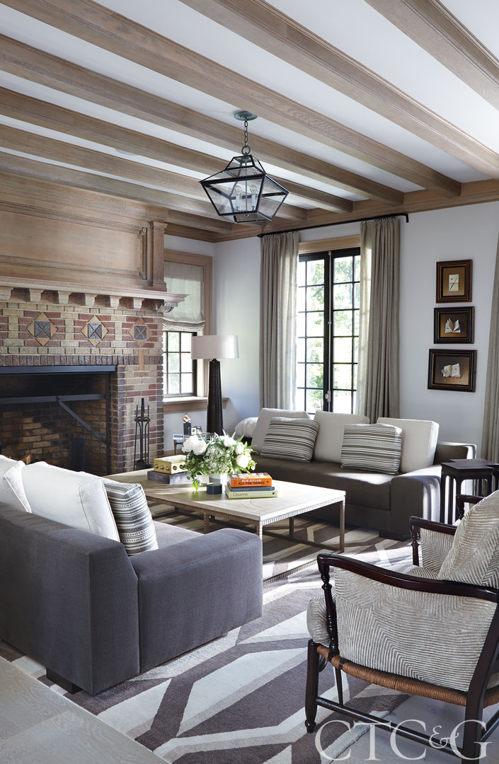 The living room, located in the older part of the house, has Holly Hunt sofas flanking a Formations cocktails table, also through Holly Hunt. Ceiling fixture is from the Urban Electric Company; rug is from JD Staron.