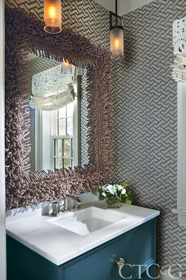 Playful moments in the powder room include a rope mirror from Holly Hunt above a Waterworks vanity and a China Seas grasscloth wall covering.
