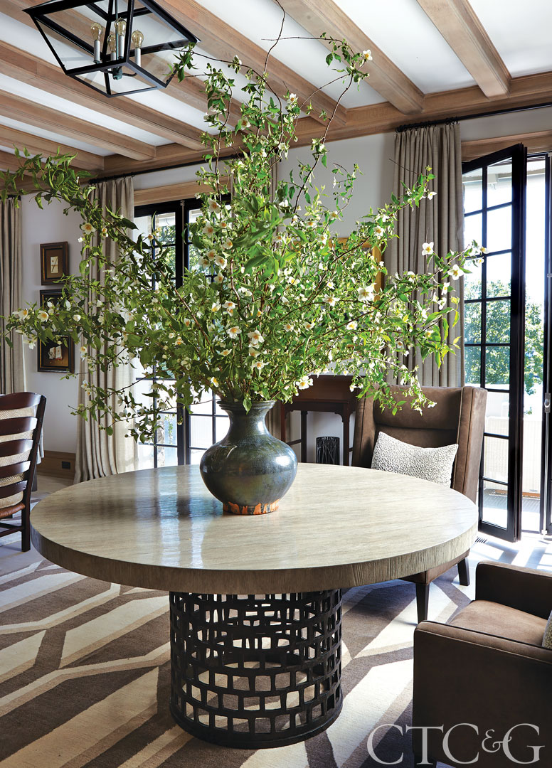 A round Gregorius Pineo table takes center stage in the sitting room. A wing chair from the Bright Group wears a Holly Hunt leather.