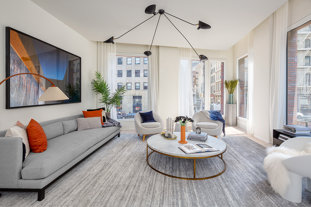 Scandinavian design is typically known for adhering to both a minimalistic and functional design aesthetic. With a neutral heavy color palette and plush textures, it is both comfortable and oh-so chic, which is probably why it is popular all over the world now. New York City buyers can now enjoy a taste of this calming style with a contemporary twist as seen in the latest listing at 100 Franklin Street.Designed by ASH NYC and managed by DDG, this newly constructed building features a distinctive triangular shape that stands out amongst the buildings in Tribeca. Currently listed for $3.295 million, this two-bedroom and two-bathroom unit features 1,427-square-feet of space that beams with a consistent use of soft and calming colors throughout and the inclusion of luxurious textures and materials. All of this comes together to create polished and fresh interiors. The spaces are also outfitted with bold pops that draw the eye, such as a Faye Toogood chair, vintage chairs from Atelier St Sabinsisal, wallpaper from Schumacher, and orange and blue accents that add vibrancy and depth to rooms.Contemporary elements that grace the interiors include the use of sculptural light fixtures, which mixes perfectly with the Scandinavian sensibility of emphasizing natural light. The residence is soaked in sunlight with oversized windows that face both the south and the east where the new owner can take in the view of sleek Tribeca. Add in 10-foot ceilings, a custom-designed open kitchen with marble surfaces and state-of-the-art appliances, and a living room perfect for entertaining that’s mixed with contemporary and vintage pieces, and this utterly stylish abode is irresistible.For ultimate relaxation, the new owner will enjoy the master bedroom with white Gretta Grossman sconces, a Noguchi pendant for soft lighting, a walk-in-closet, and ensuite bathroom with a double vanity that offers integrated sinks and custom-mirrored medicine cabinets.The building also offers several shared amenities such as a virtual doorman, package room, and bike spots.Tamir Shemesh and Marie-Camille Negrin of Douglas Elliman hold this luxe listing.