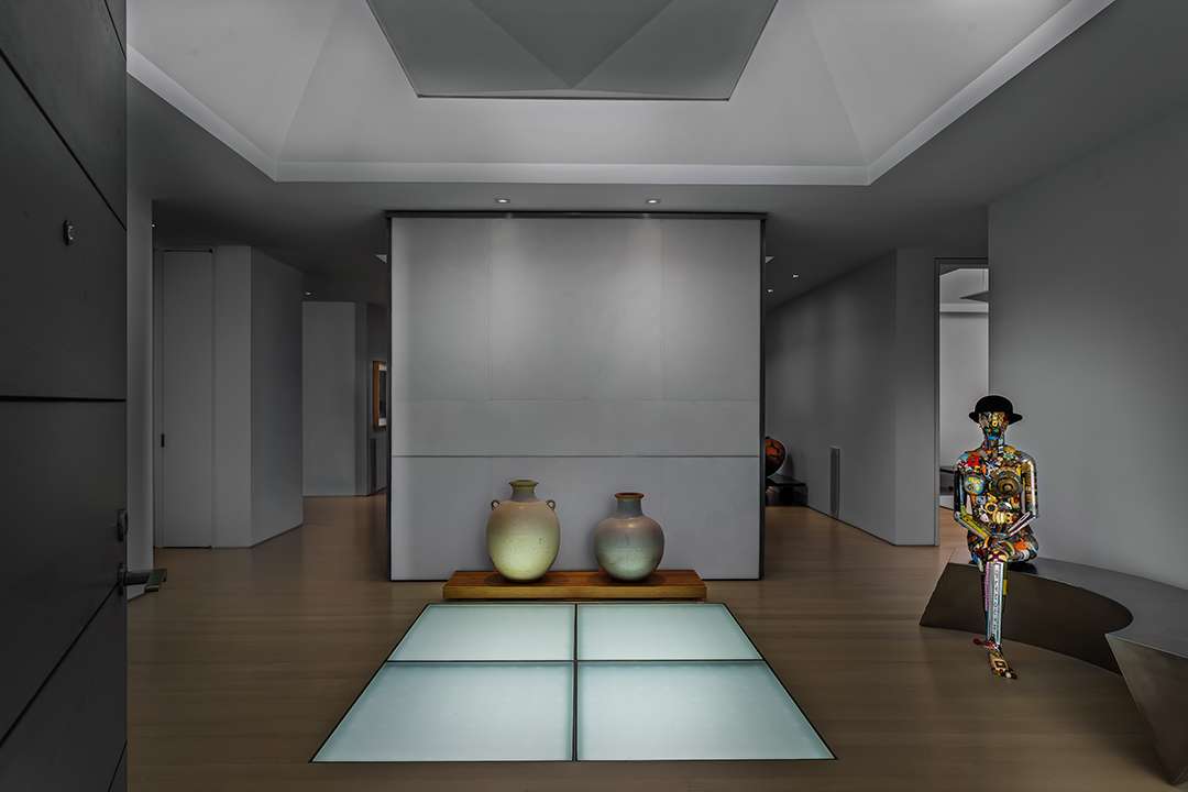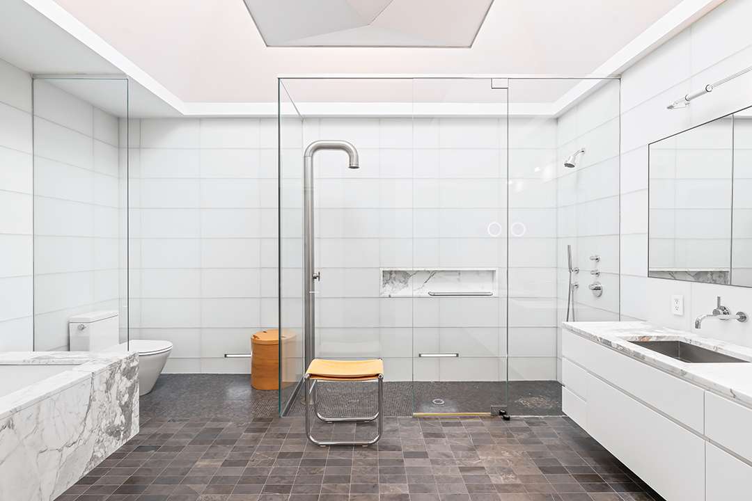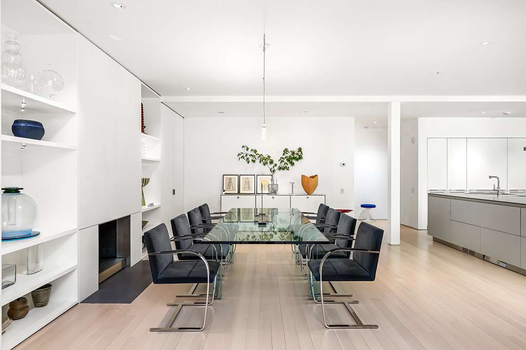 Its iconic motif remains, though—a rooftop punctuated by pyramid-shaped skylights and a lattice-work facade, both designed to let in light while ensuring privacy. The nearly 5,000-square-foot interiors are also light and bright, thanks to glass walls, satin-bleached oak flooring and “floating” walls that result in partial barriers from room to room, creating a feeling of airiness.