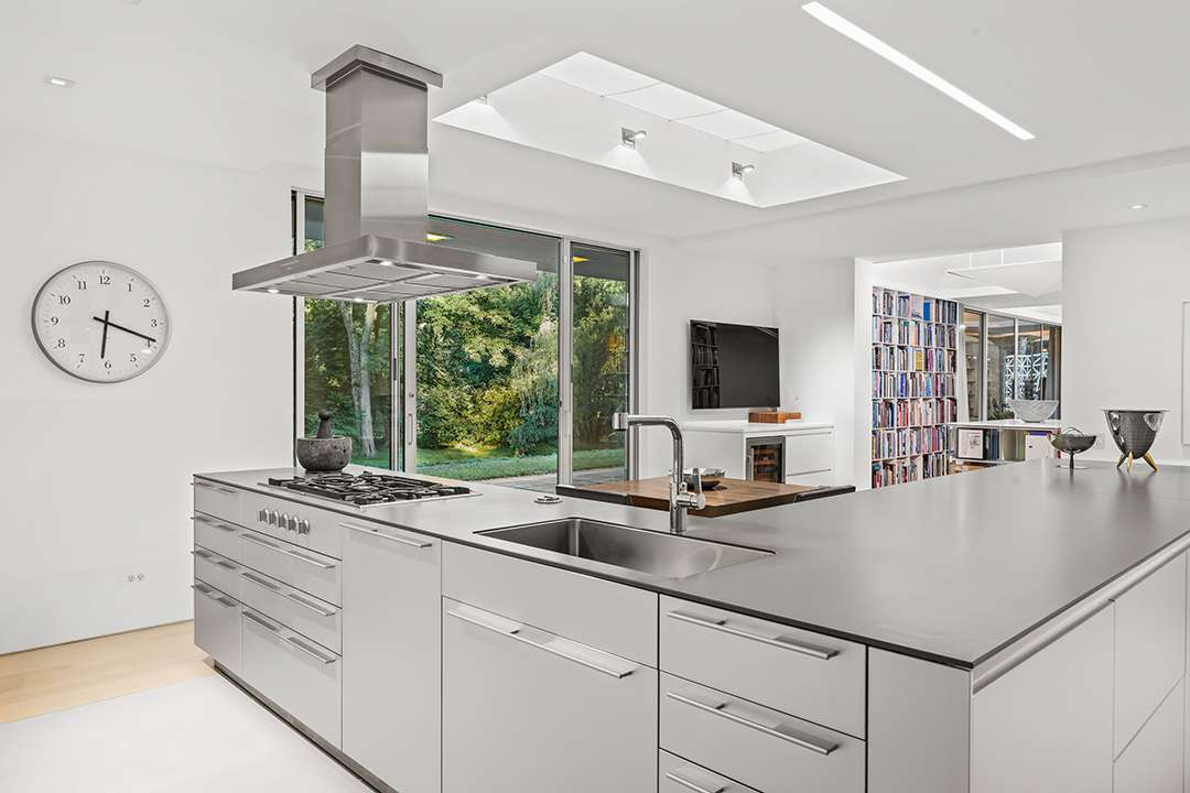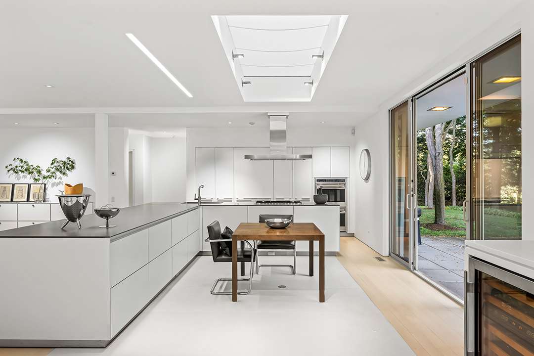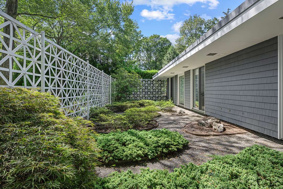 The property, known at The Celanese House, sits in the Fairfield County town most closely associated with modernism: New Canaan. It was designed by Edward Durrell Stone, whose credits include Rockefeller Center, Radio City Music Hall and the Museum of Modern Art. The home was commissioned as a showcase for the Celanese Corporation’s synthetic textiles (hence the name), but over the years has been renovated and expanded, now featuring a new kitchen and primary suite, among other spaces.
