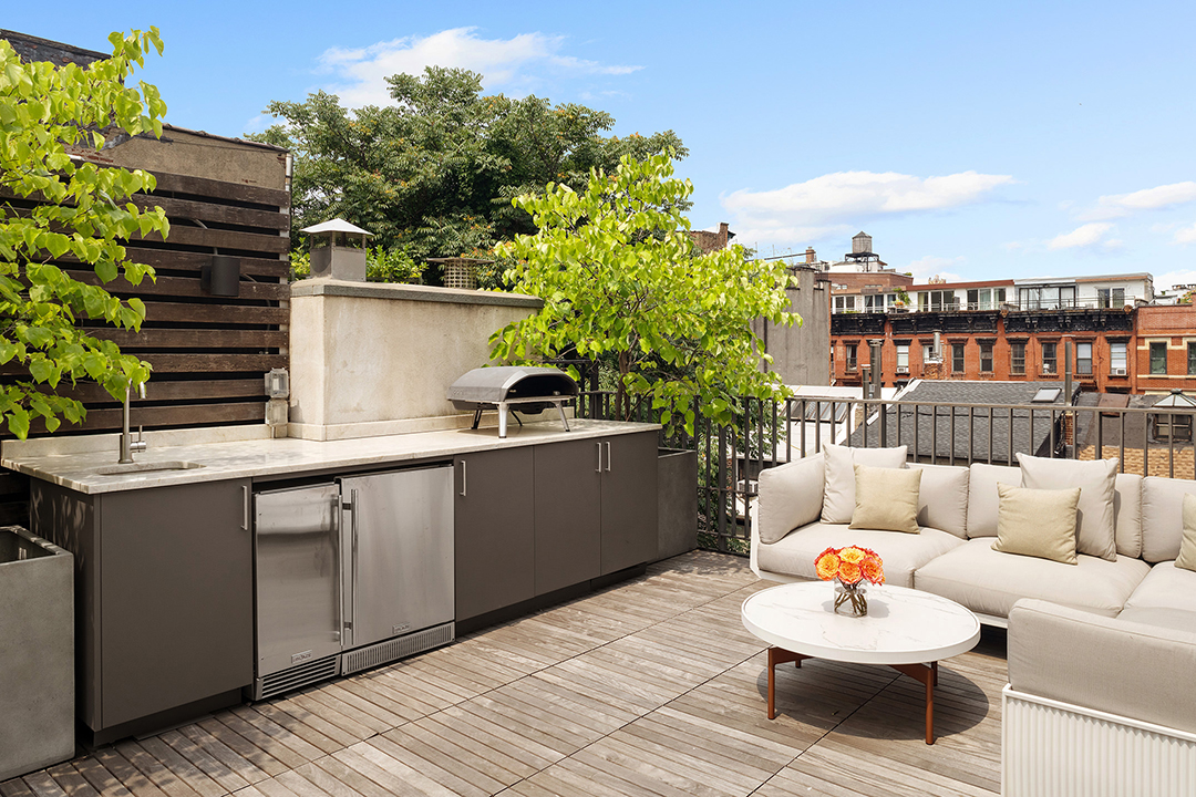 With BKSK Architects at the helm, clever touches like this can be discovered throughout the four-bedroom home. Its five levels are worth the climb with the primary suite occupying the entire top level and showcasing custom closets, a spa-like bathroom, and many destinations for relaxation. From there, the actors could also easily access the verdant rooftop deck crowning the gorgeous address.