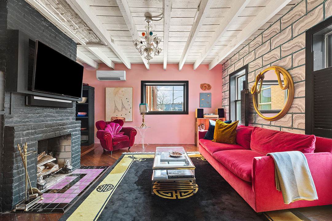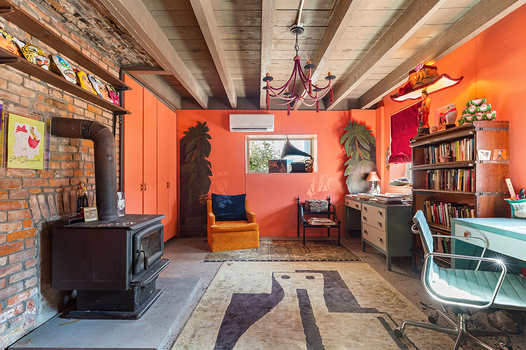 Color, character, contrast, and artful decor abound, whether you’re getting cozy in front of the pink living room’s wood-burning fireplace, working in the orange detached office/studio, or waking up in the lacquer blue bedroom with a clawfoot bathtub. The 2,382-square-foot home is move-in-ready for fashion-lovers who appreciate unique touches and wish to make a statement, or buyers with tamer taste can easily make the home most subdued with easy cosmetic changes. Built in 1910, it has likely seen many styles on its walls.