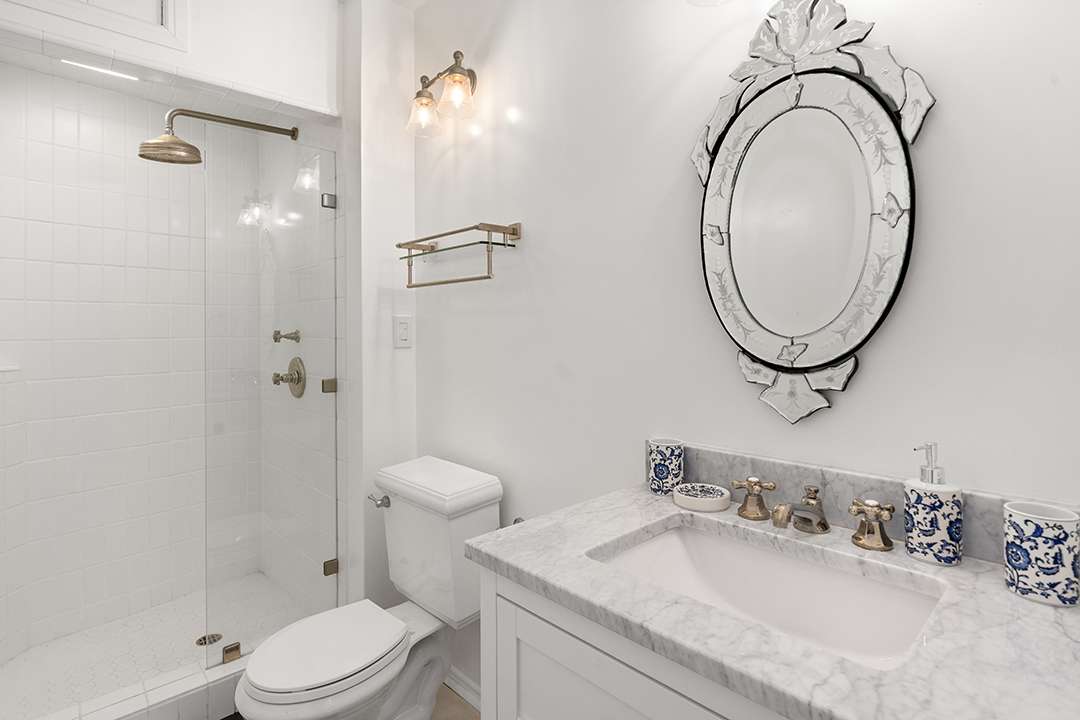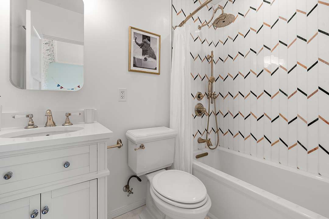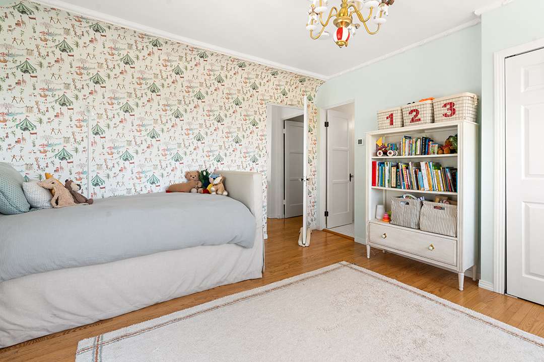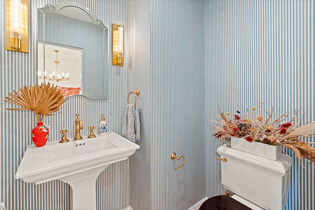 Its spacious yet comfortable living room is centered around a wood-burning fireplace with a blue and red palette playing out on the furniture and walls, before leading to the heart of the home: The kitchen. Marble countertops, timeless white cabinetry, and black and white checkered flooring exude enduring glamour while a sunny breakfast nook with chic upholstery allows for people to come together for casual meals. Heading upstairs, the primary bedroom offers a restful oasis with a spa-inspired bathroom, and the additional bedrooms sit neatly nearby.