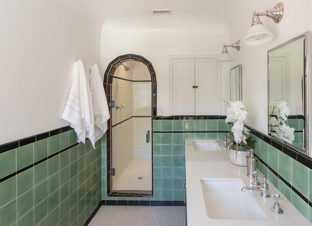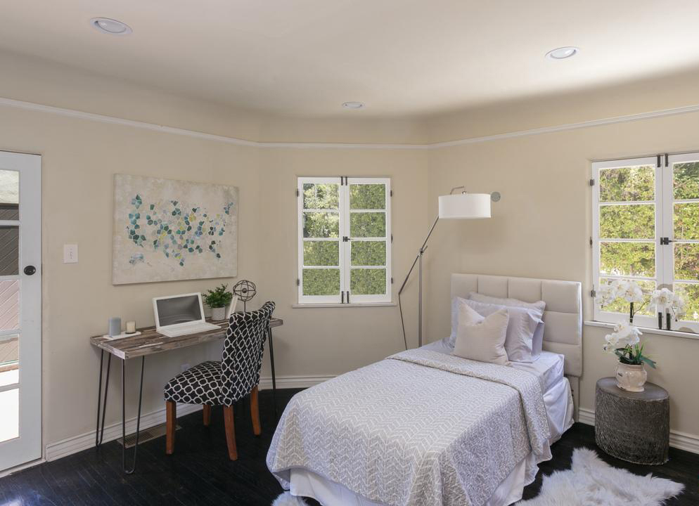 Some of the home’s best features are the cozy fireplaces and the spacious dining room, which could easily fit A Wrinkle In Time’s entire leading cast. The master bedroom boasts a cheery dressing room and bathroom with a splash of vintage green tile. There are some additional character-building traits outside. Head up the driveway, and you’ll come to a former garage/now fitness center with sky top roof. And perfect for a quick relax after a workout is the casually intimate yard adjacent to an intricate herringbone-patterned patio. It’s those interesting juxtapositions that make this, small-by-Hollywood-standards-bungalow an absolute delight.