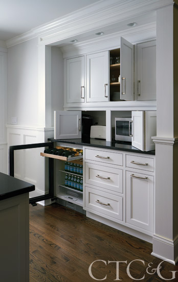 The overriding concept was to create a tailored, elegant, clean-lined kitchen. Marc’s dream was to create a kitchen where every item could be stored and nothing would ever sit on a countertop. I love collecting French crystal and English bone china. I wanted a kitchen where I could showcase and easily use my collection. Finally, I needed to find a kitchen designer who could completely rethink our space and needs—natural light, traffic flow, work flow and space utilization.