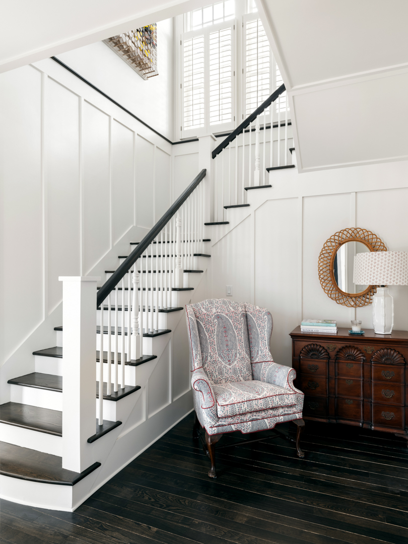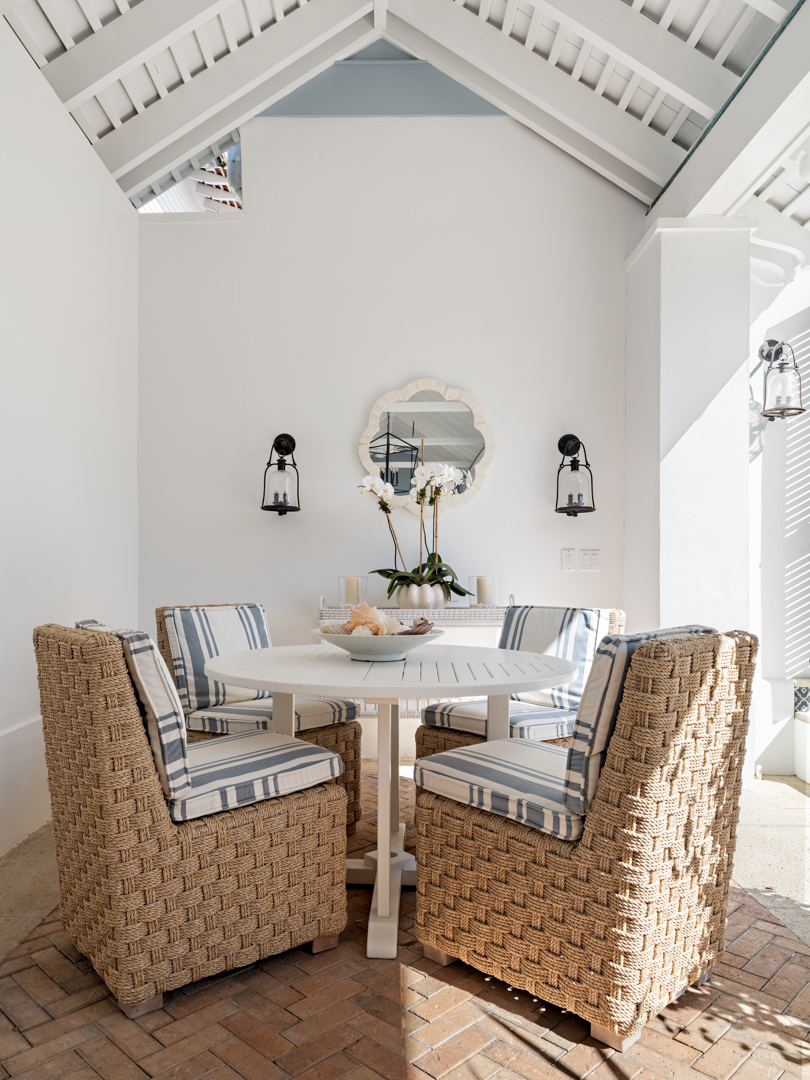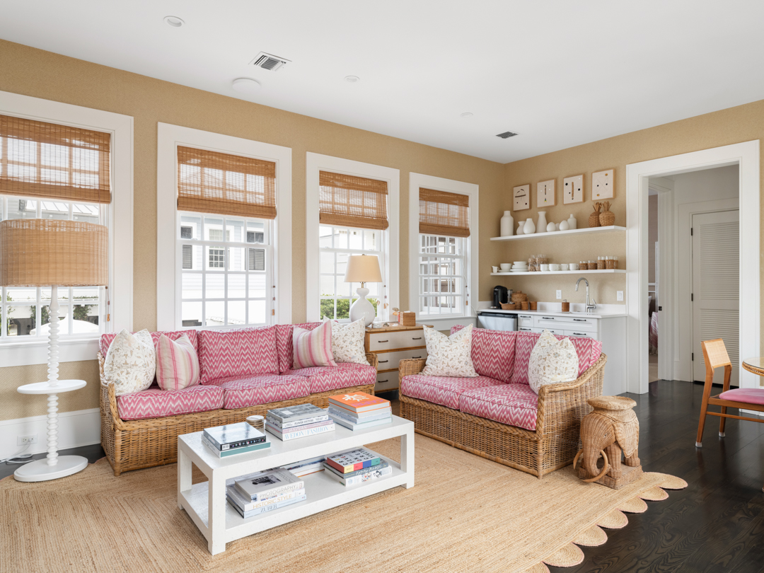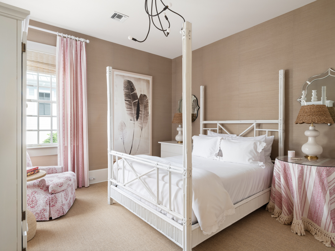 While these beachy hues fill the main living areas, Branca did not hold back with her signature approach to color and playful prints: A Paisley print wraps chair cushions to complement the red-striped dining room, a wicker sofa’s bright cushions are covered in Casa Branca’s Vimini, and there’s no shortage of accent trims and wallpapers. “I love the warmer side of red; it works north and south, in the city and country, in the tropics and mountains, like that wonderful peony, a deep pinky Pompeiian red,” Branca told CTC&G in 2021.