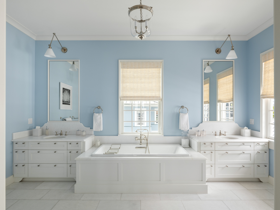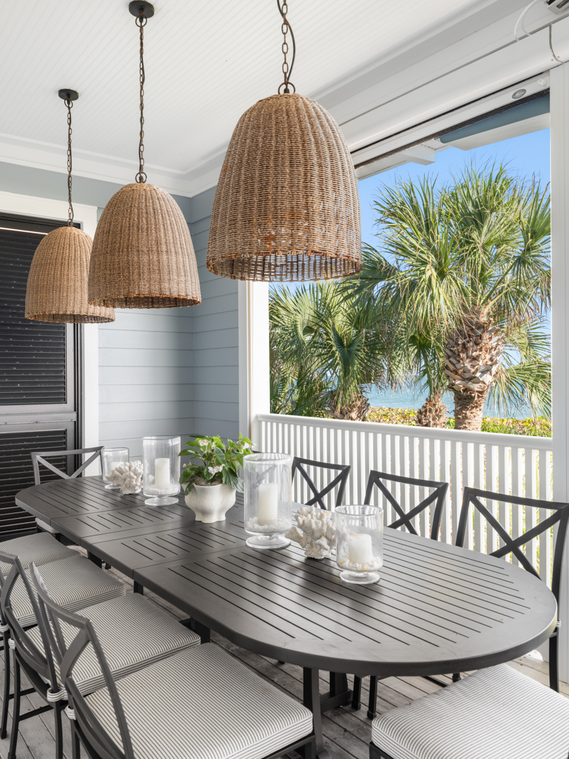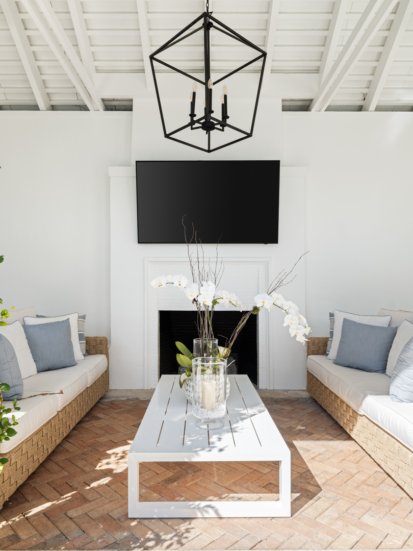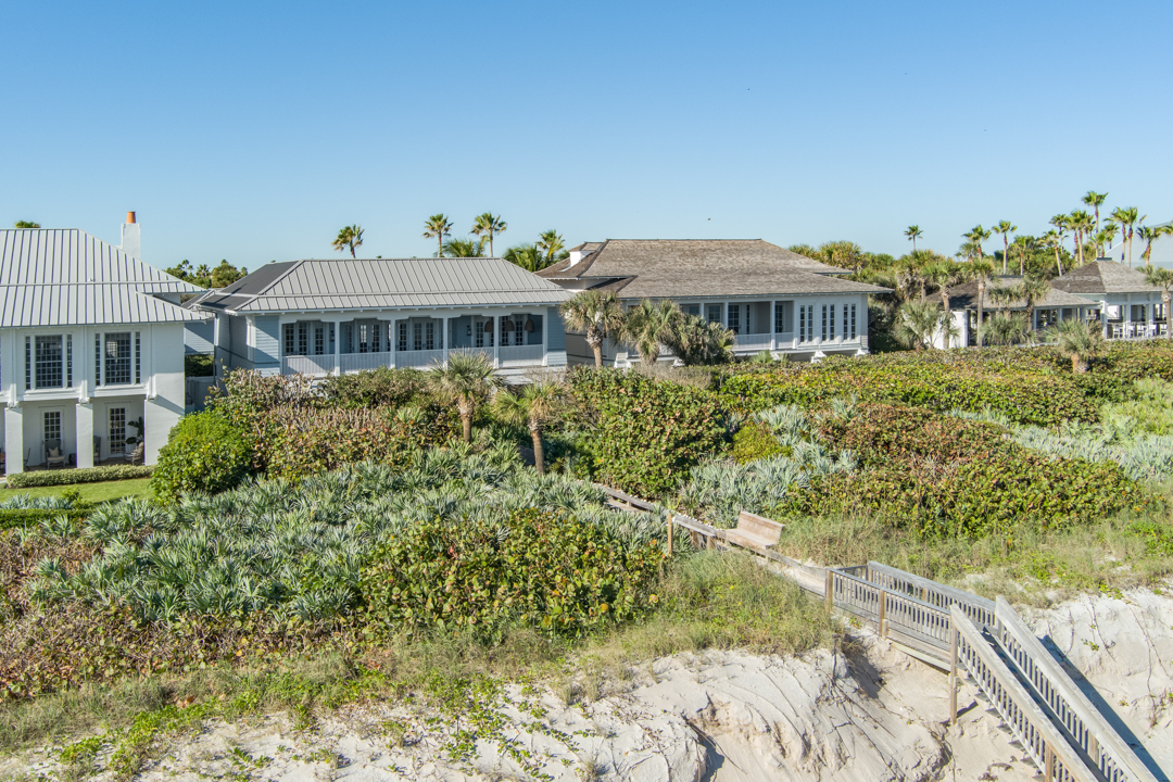 Designed by Merrill, Pastor & Colgan Architects, the two-story, 5,365-square-foot beach house is thoughtfully laid out. An entry garden leads to a gorgeous pool area that looks straight out of Palm Beach Cottages & Gardens, surrounded by a loggia and trellis for lounging in the sun or retreating to the shade. Of course, there’s an outdoor bar for suave hosting and plenty of terraces. For overnight guests, the home has three bedrooms in the main structure and two additional bedrooms (each with their own bathroom) in a detached suite above the garage.