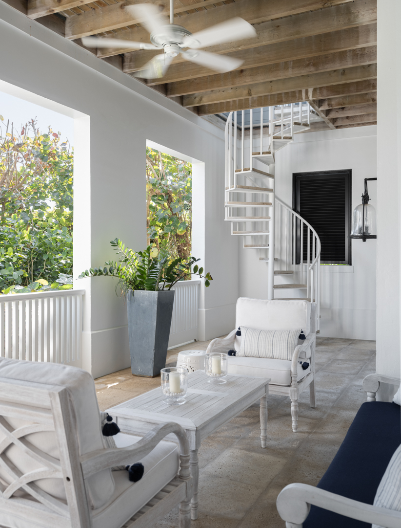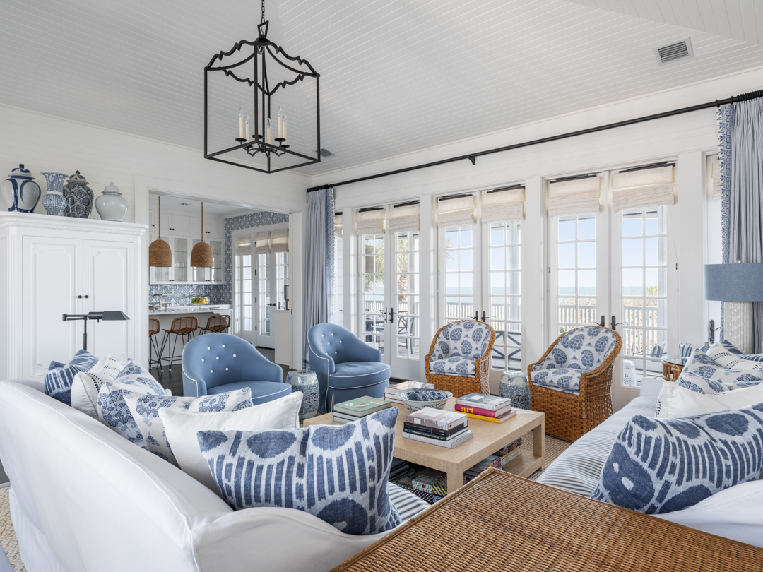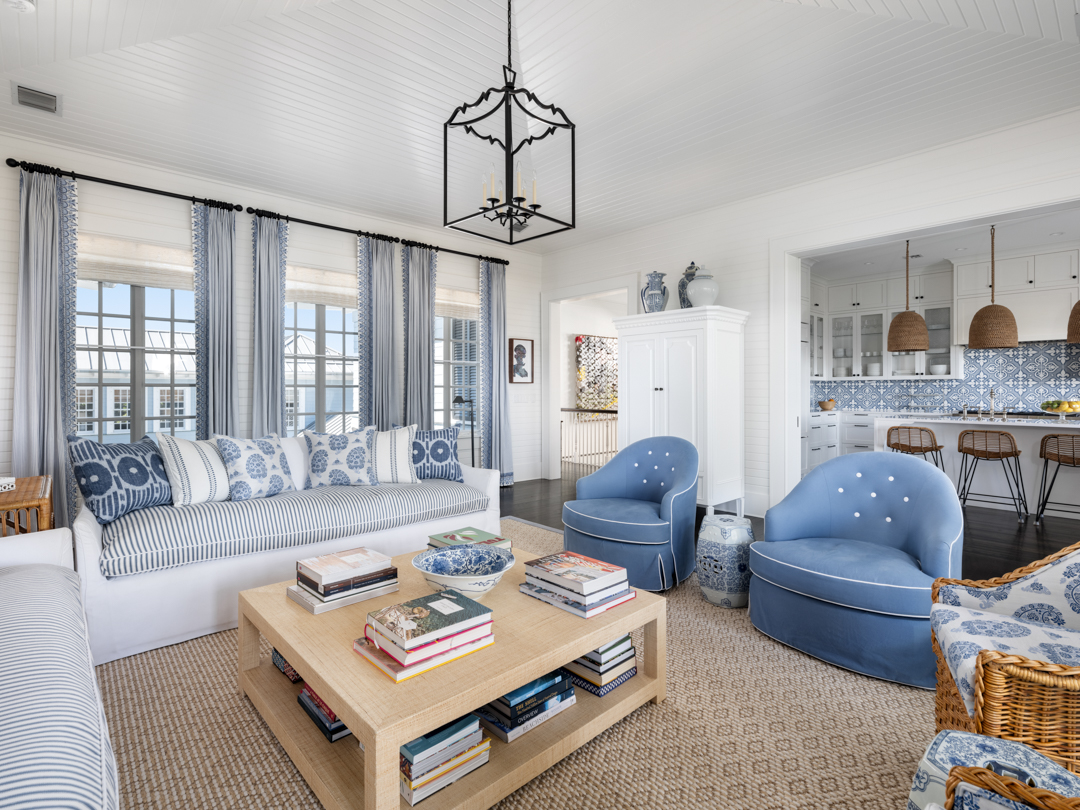 Continuing with the layout, most living areas are actually upstairs to take full advantage of the turquoise Atlantic Ocean views. A blue-and-white living room boasts French doors that swing open to a 50-foot-long terrace spanning the length of the home. Nearby, blue-and-white patterned tile add a punch to the otherwise all-white kitchen and continue the coastal polish.