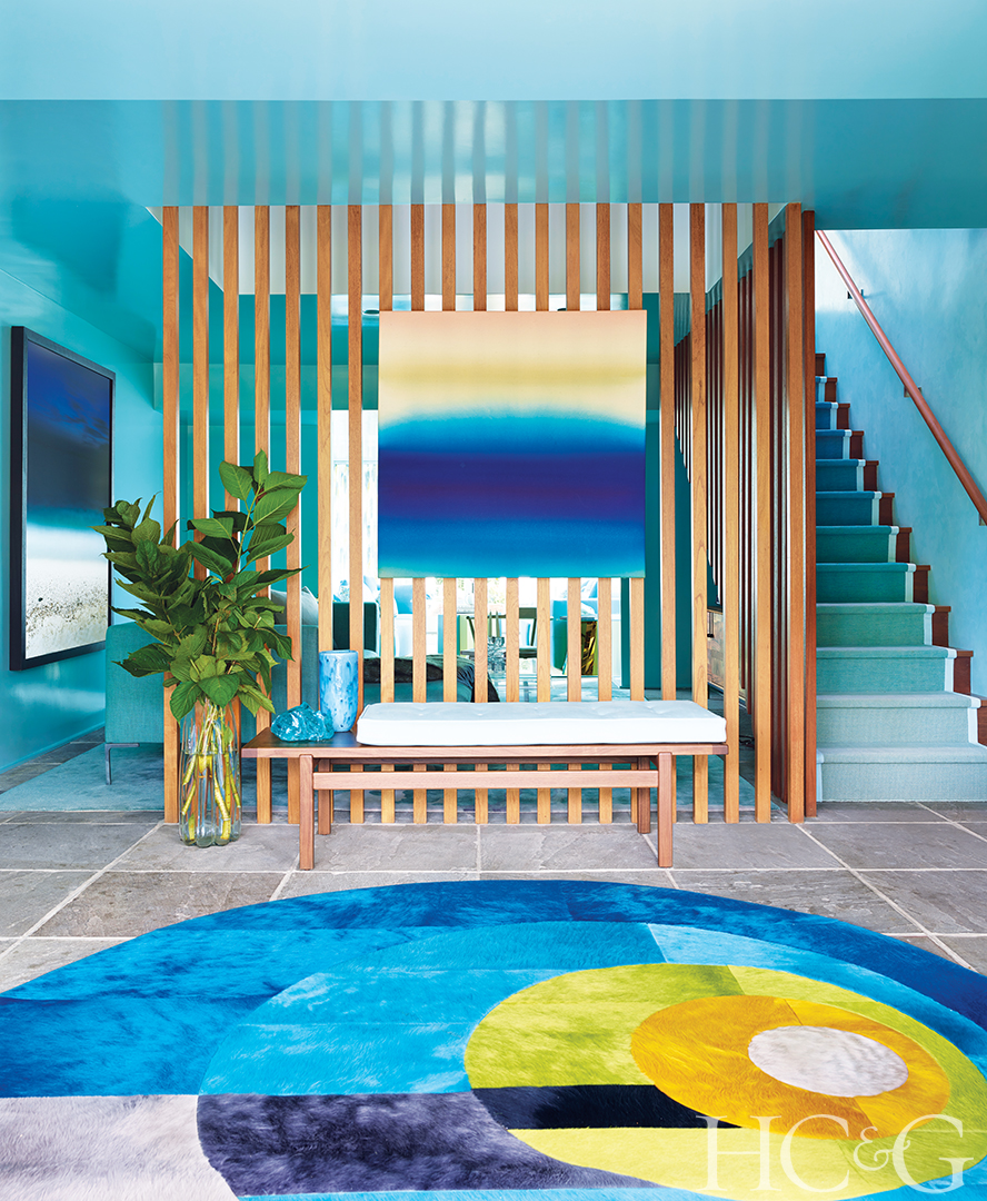 A Sydney Butchkes painting hangs above a Jens Risom walnut bench in the entry; the Lau-designed area rug is from Kyle Bunting.