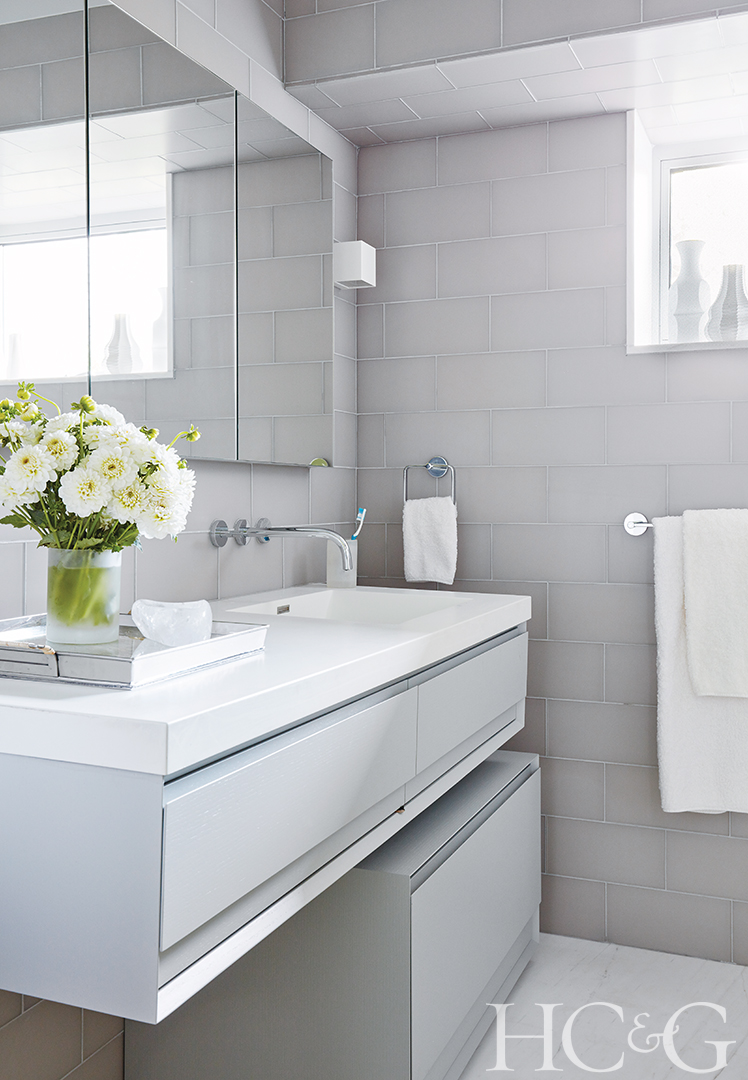 In the guest bathroom, the freestanding vanity is from Wetstyle and the faucet is from Kallista.