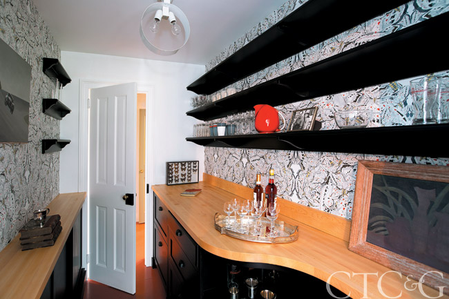 In the bar/pantry, White Moth wallpaper by Timorous Beasties adds a humorous touch. The vintage Stilnovo light fixture is from Mass Modern Design.