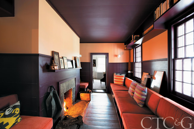 The architect turned the long, narrow room between the living room and mudroom into a warm, winter gathering place. The seating that flanks the fireplace and the banquette cushions by Ritz Upholstery wear cotton velvet by Osborne & Little with pillows fashioned from vintage French textiles. Framed family photos and vintage Paris Review posters line the fireplace mantel.