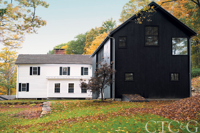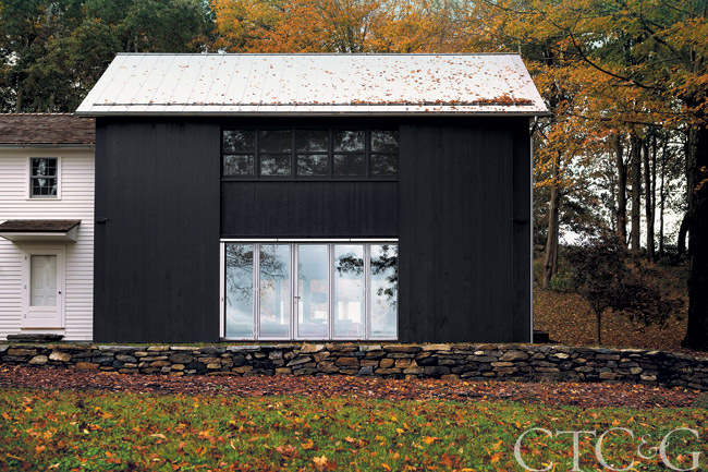 Architect Douglas Wright refurbished an existing 19th-century clapboard farmhouse and updated the property with the introduction of a contemporary black barn. The rough-sawn pine structure includes a standing seam metal roof and 18-foot-high doors that slide closed over the windows and doors to block the morning light into the second-floor master suite.