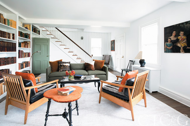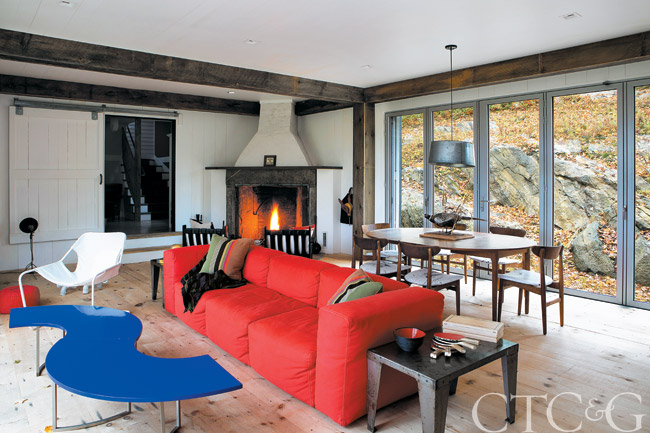 A red Cappellini sofa and bright blue coffee table from Bloomfield enliven the family room in the new barn. The white chair is from Design Within Reach, and the black side tables and light fixture are from a local antiques store. The 1960s Danish teak dining set is a family heirloom with the chairs featuring custom leather upholstery by Fawn Galli Interiors.