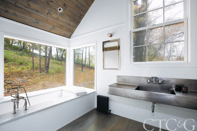 With a Kohler tub perfectly situated to enjoy the view. The master bathroom features a vintage Montel sink from Wyeth fitted with a Harrington Brass wall-mount faucet.