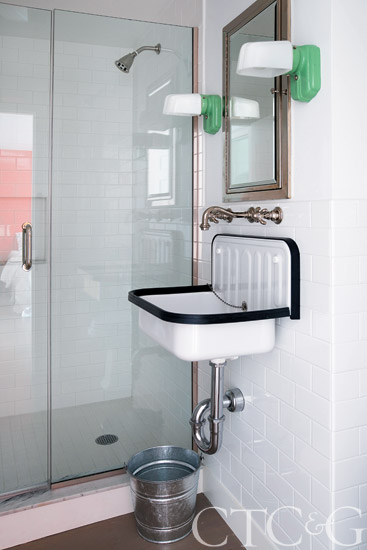 The kids’ bathroom features an Alape wall-mounted sink, an RH medicine cabinet and Nemo wall tiles. The green deco-style sconces are from School House Electric, Co.