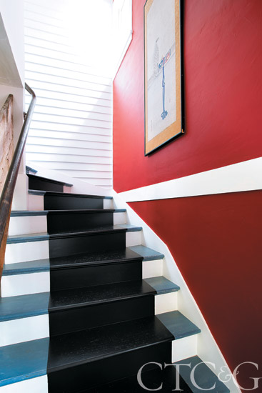 In lieu of a carpet runner, the designer had the back staircase painted to make it durable and give it personality.