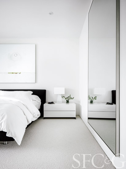 Gary Blum’s Lone sounds a quiet note above a striking black Niels Bendtsen bed through Hive Modern. Side table and lamp are also from Hive Modern. Bedding is through the Company Store.