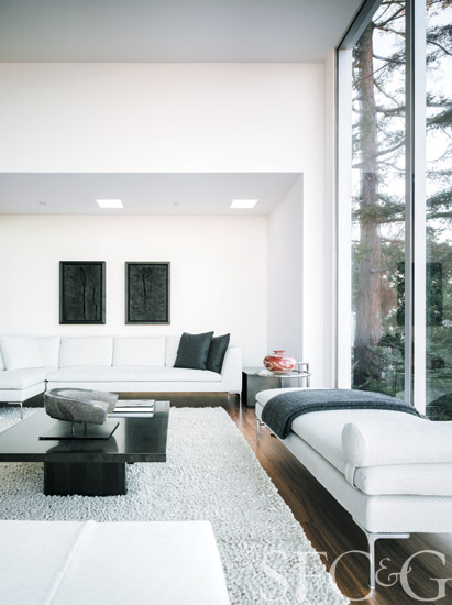 B&B Italia sectional, chaise and cowhide poufs surround a coffee table from Catherine Memmi of Paris. Lounge chair and ottoman are through Design Within Reach. Side table is by Tod Von Mertens.