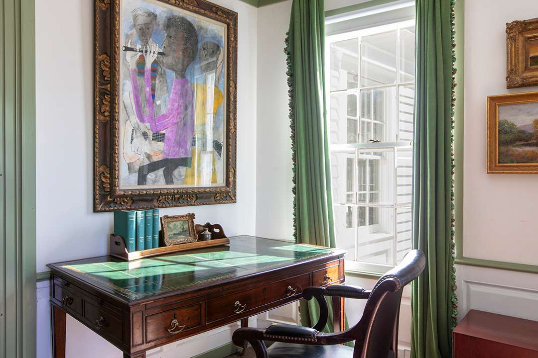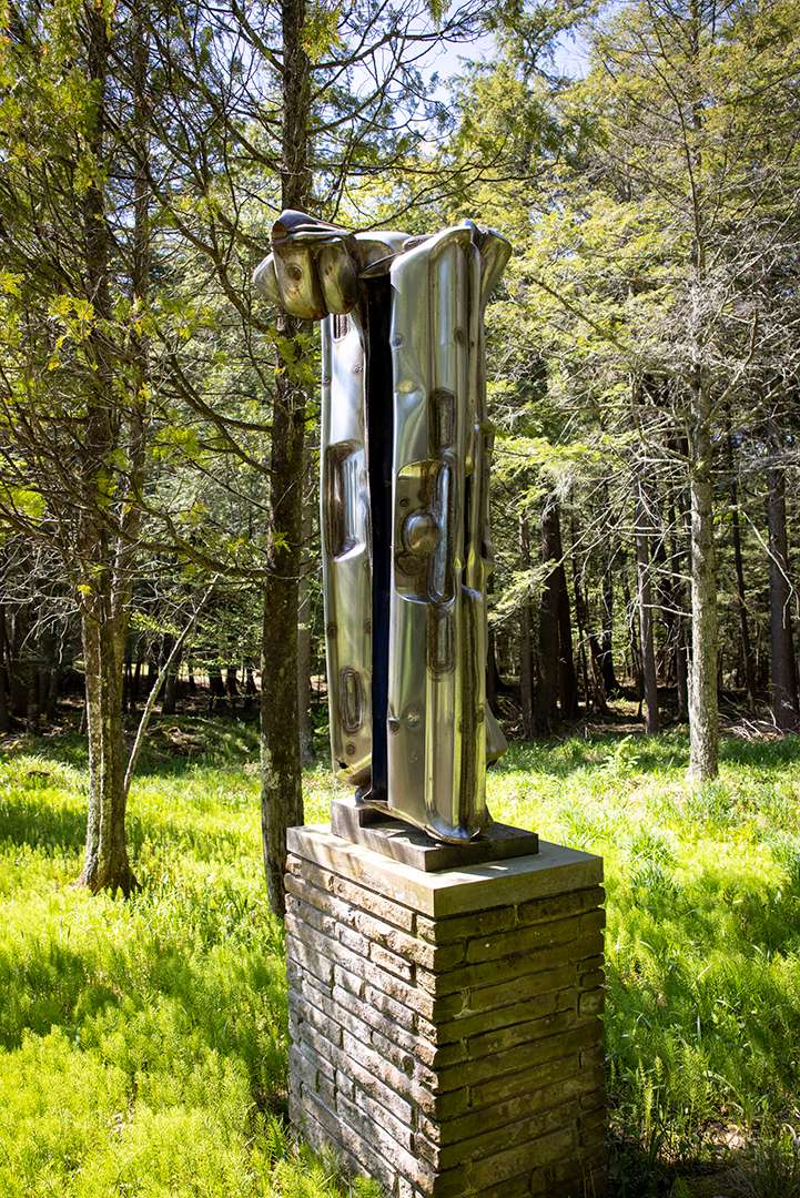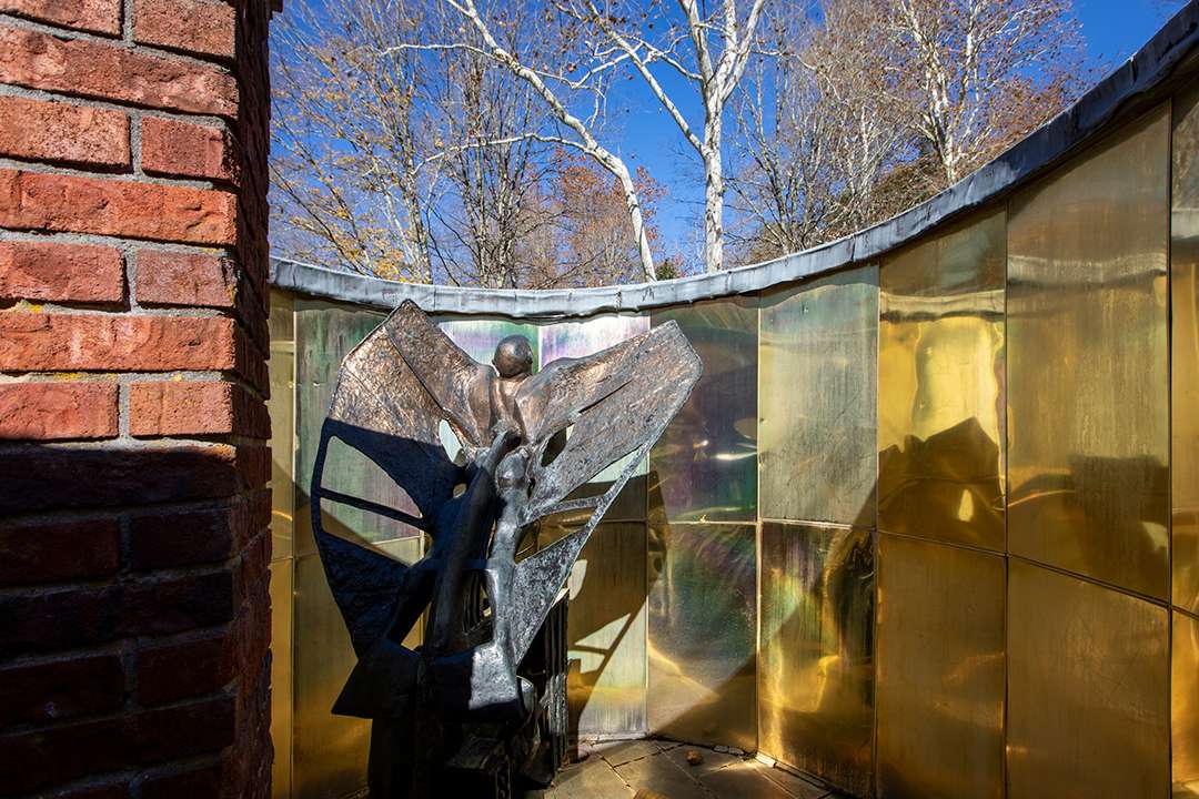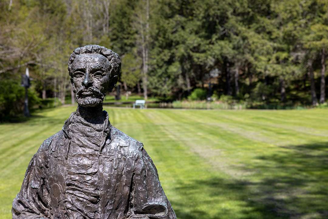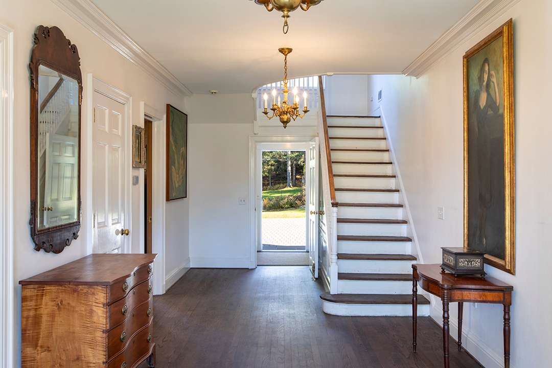 That’s not the only piece of art on the property though, as more than a dozen other sculptures can be found along the grounds. Moving to the home’s interior, it’s a classic Colonial that was renovated in 2016. Many of the rooms boast original moldings and fine details, but updates have also modernized the 5,200-square-foot home. The kitchen is especially interesting for the eye, boasting all steel countertops and cabinetry as well as curving center oven hood with geometric details.