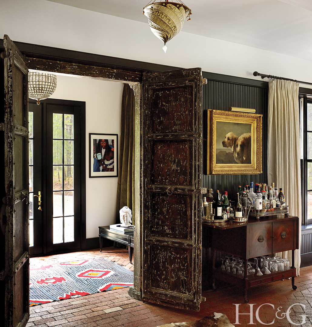 Decorative Indian mahogany doors from the late 1800s beckon in the entryway; the bar dates from the 1930s.