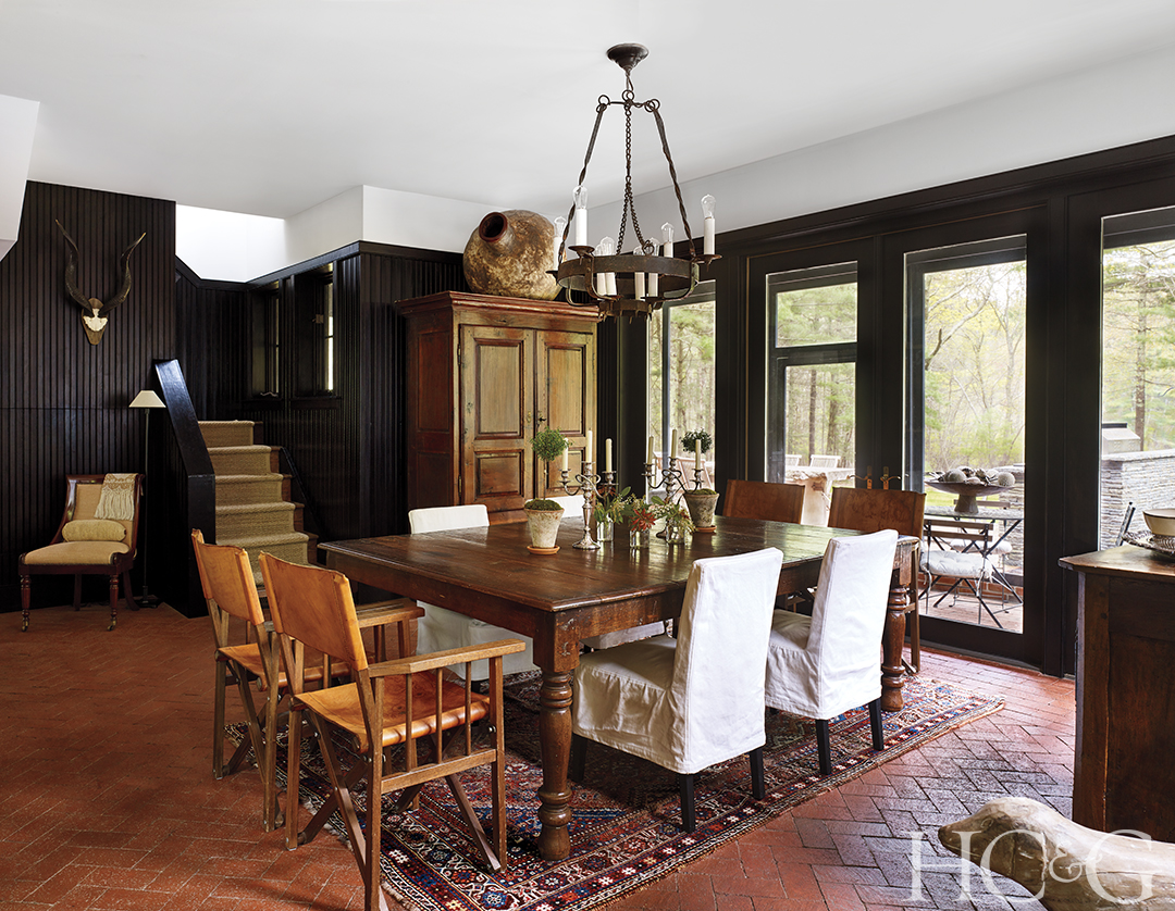 In the dining room, Kenyan leather safari chairs and slipcovered seating from RH surround a table fashioned from an Indian bed.