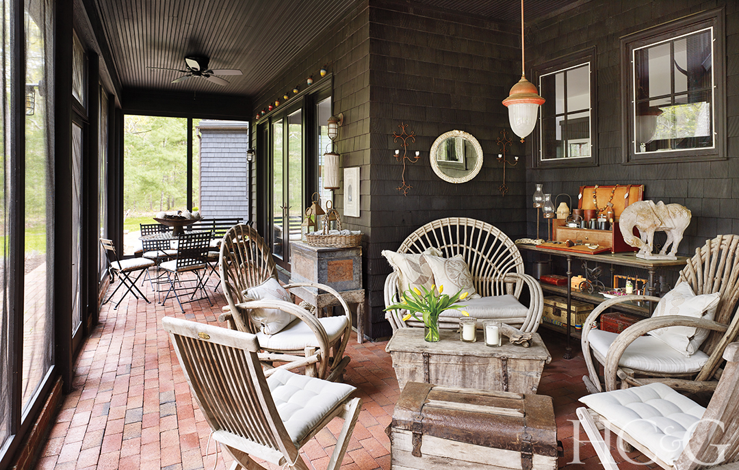 The bent-twig fan-backed chairs on the back porch are from Mexico.