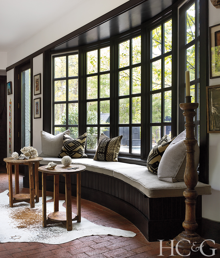In the main hallway, pillows fabricated from African Kuba cloth top a banquette.