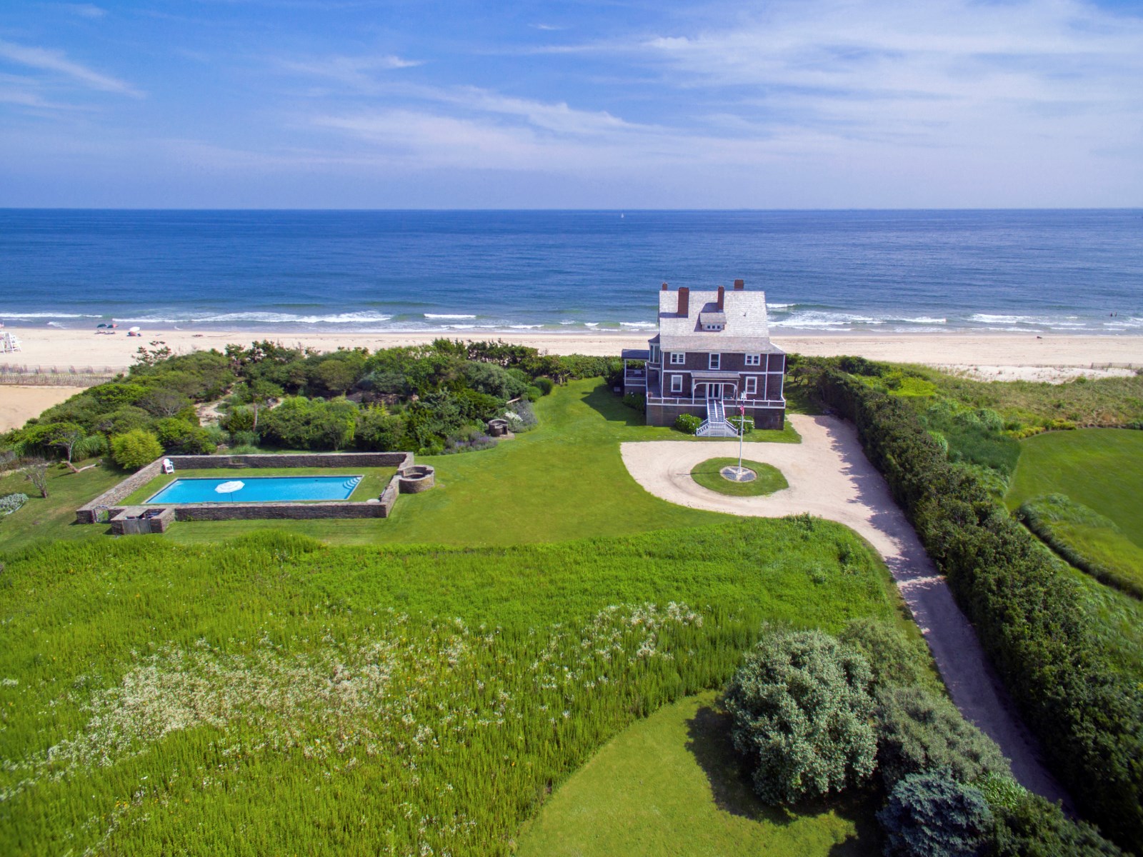 Called Kilkare, the circa-1877 home sits on 3 acres and boasts 330 ft of direct ocean frontage. The property additionally houses a heated pool and zen meditation garden.