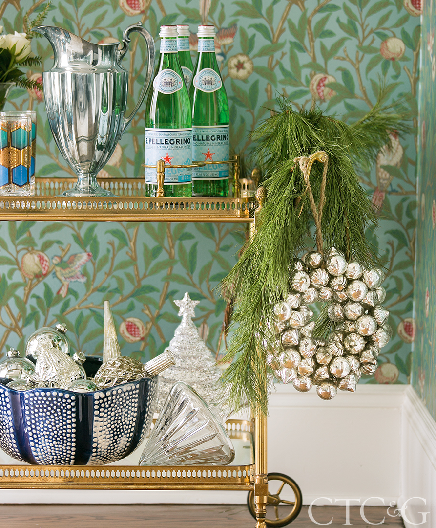In the dining room, with its peacock blue and green metallic wallpaper, an elegant tablescape of glass trees adds a touch of modern sparkle, while an antique French vitrine topped by a gold menorah, the first bought as a couple, is a nod to her husband’s roots. (Although this menorah is purely for decoration, the family lights another one every night of Hanukkah.) Even the 1920s bar cart is festively dressed with fresh greens, a silver wreath and a bowl of mercury-glass ornaments.