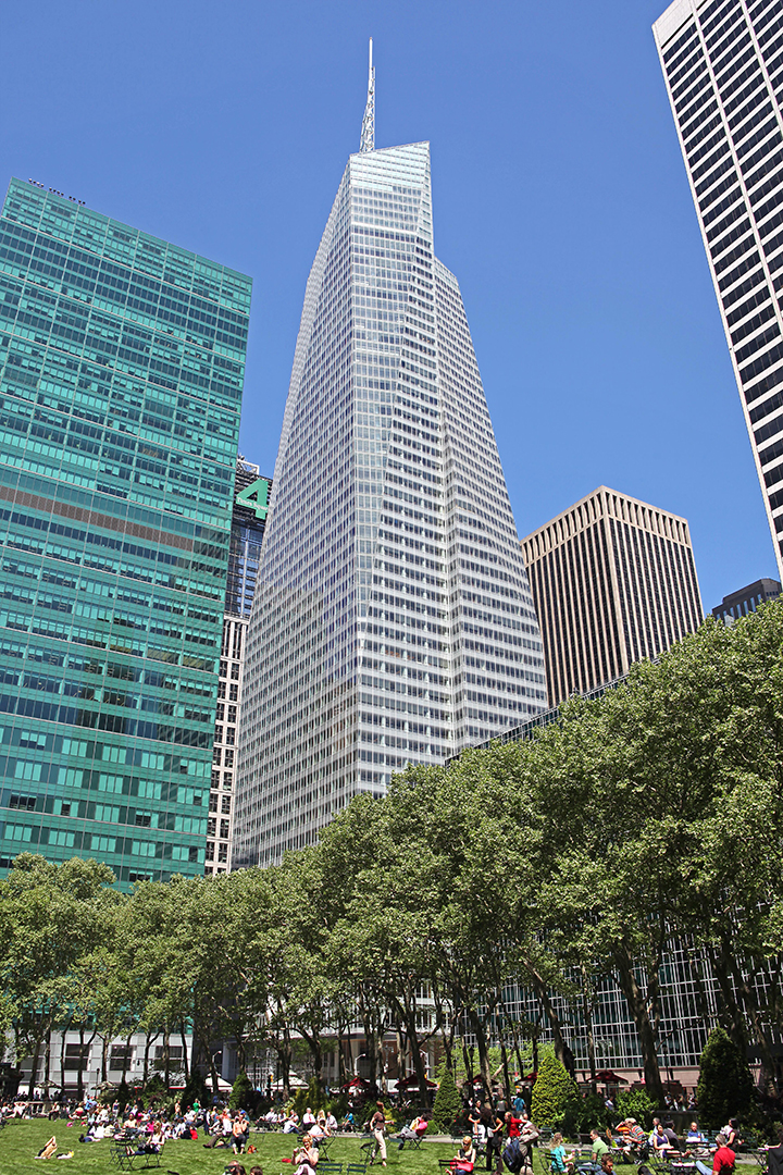 Located at One Bryant Park, Bank of America‘s NYC headquarters merges the ethics of the green building movement with a 21-st century aesthetic of transparency and re-connection. The fifth tallest building in NYC, completed in 2010, its emphasis on daylight, fresh air, and a connection to the outdoors creates a high quality modern workplace.