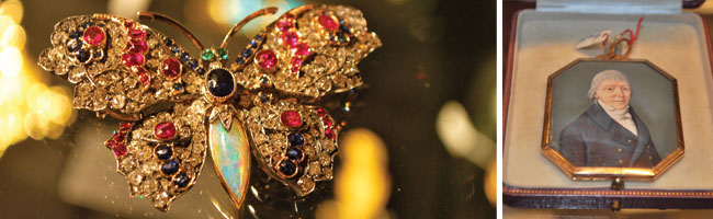 For botanical and bug-inspired jewelry, the booth of Le Sot-l’y-Laisse had a gorgeous bright blue enamel wild rose brooch dating from the 19th century in the style of the house of Cartier. An ornate butterfly brooch was encrusted with rose cut diamonds and precious gems.