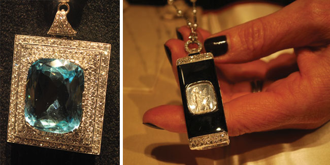 If you prefer smaller goods that are equally dazzling and pricey, then you would have been able to choose from several exceptional estate jewelry dealers at the fair. Laurence Fayolle from Lyon had a collection of stunning jewelry including a 19th-century necklace featuring a 45 carat square-cut aquamarine surrounded by 50 carats of diamonds set in platinum (priced at 100,000 Euros). An exquisite black enamel lorgnette (folding eyeglasses) by Cartier was also among the mix.