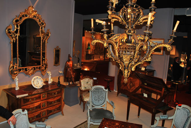 Booths are elegantly decked out with the crème-de-la-crème of Rococo and ornate marquetry furniture and objets d’art, the majority coming from 18th-century France. If your vision of grandeur includes lots of gilded and highly polished furniture, then you would have loved the booth of Gilles Linossier, whose business is based on Paris Quai Voltaire. Gilles has been participating in this fair for the past 12 years. And his chic booth has exquisite examples of 18th-century Louis XVI tables, sideboards and tapestries, plus an immense 19th-century gilded wood (bois d’oré in French) chandelier (lustre in French) coming from an Austrian royal family.