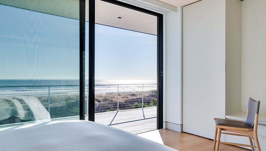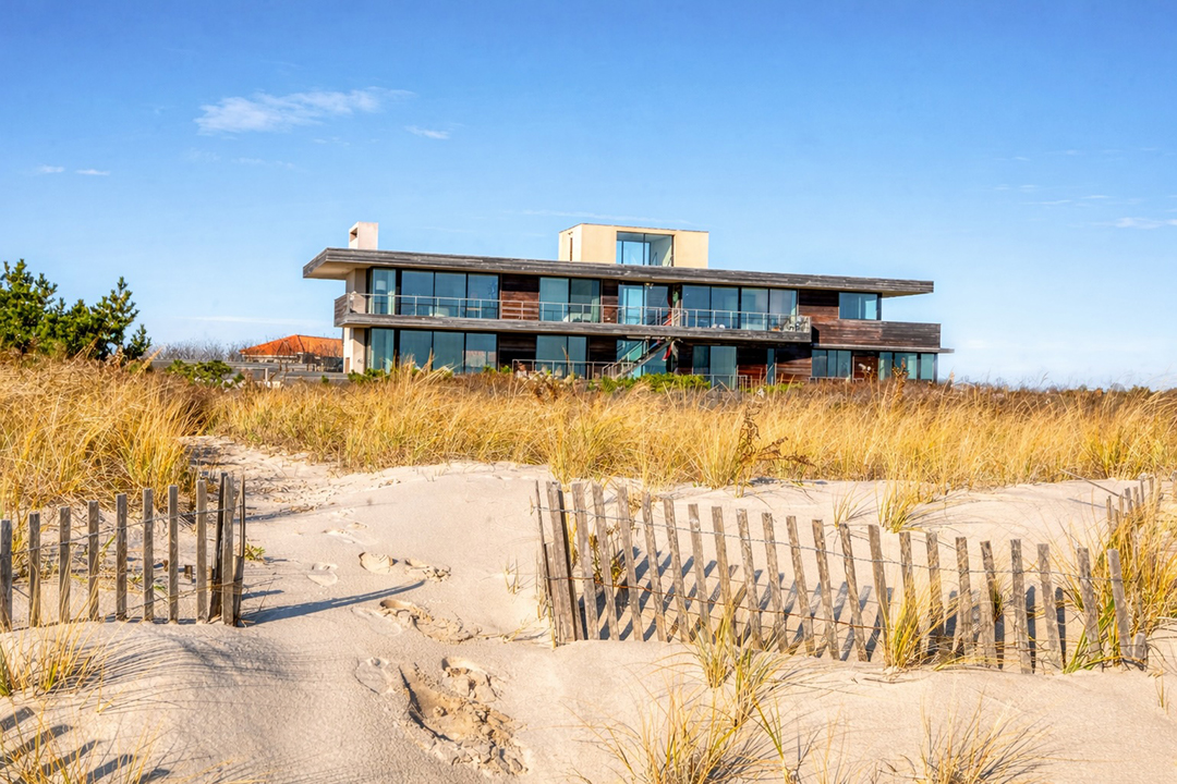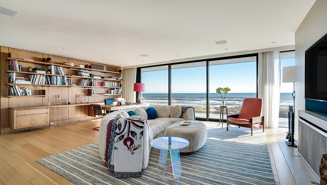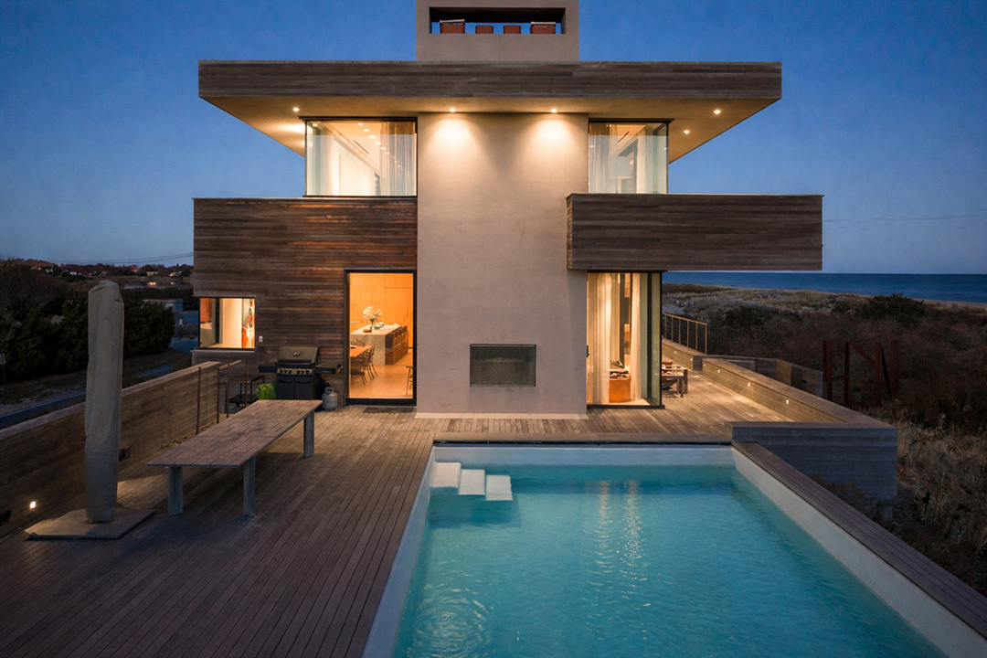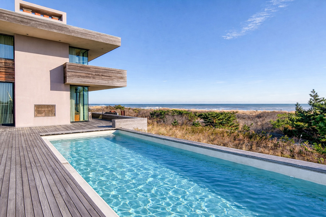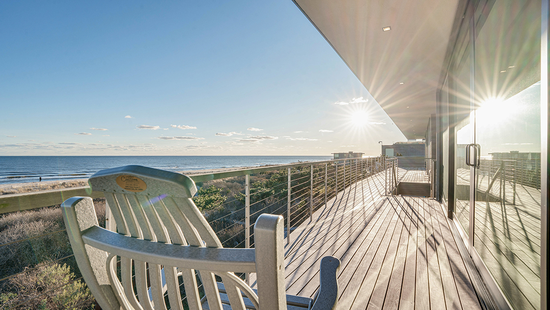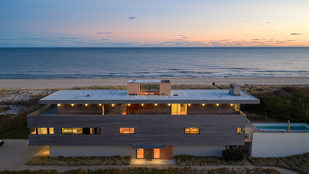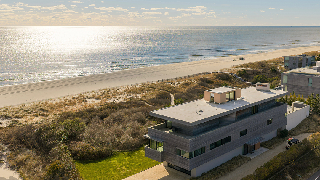 One could call the home a brilliant emerald-cut with its boxy, clean-lined architecture. It looks polished and sleek from the outside, while glass-clad spaces inside encourage you to take in the oceanfront scenery at every turn. There are seven bedrooms for welcoming family and friends, plus luxury perks like a three-story elevator, a heated saltwater pool, and a rooftop that can still be customized. With expansive balconies and an outdoor shower, too, you can practically live outside in the summer. A quick walk past the dunes is all it takes to have a splendid beach day.