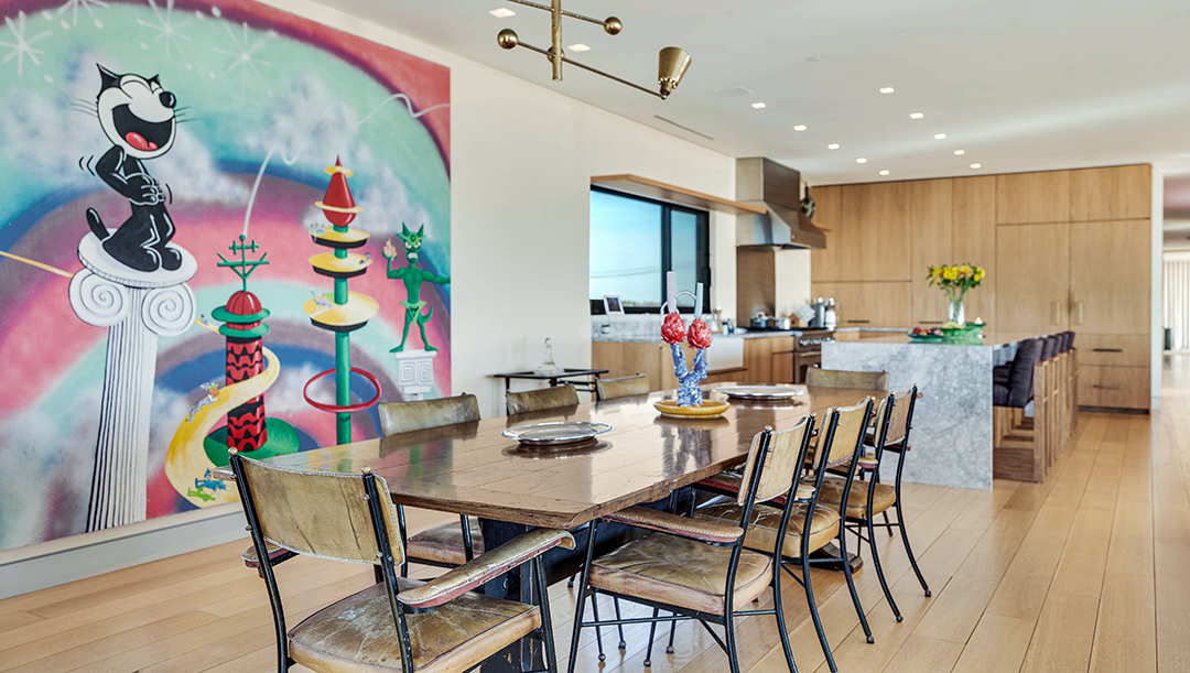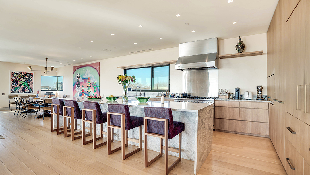 The diamond mogul bought this nearly two-acre property in the 1980s and commissioned Mark C. Matthews Architecture to design it in collaboration with Francis D’Haene of D’Apostrophe Design. Meticulously done, it took almost 10 years for the 7,059-square-foot residence to come to life. Per the listing, it was crafted to be a private family getaway but also to have a gallery-like quality so Arslanian could display pieces from his extensive art collection. He owned works by Basquiat, Keith Haring, Warhol, Jeff Koons and Julian Schnabel. You can quickly see how the large walls are intended for artful use, such as in kitchen.