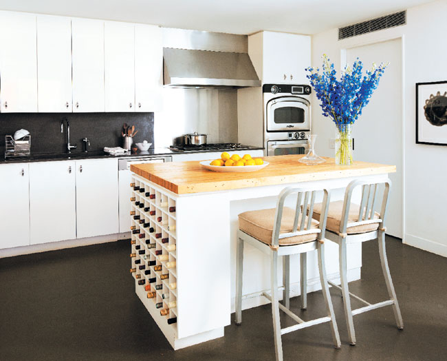 Dining By Design | The cheery breakfast nook and banquette are tucked into a corner of the tidy chef’s kitchen, which features built-in wine storage in the island, a Miele dishwasher, and Wolf ovens, cooktop, and range.