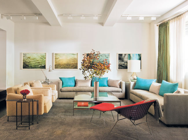 Sitting Pretty | Two Terry Winters prints rest on shelves built for displaying art. In the living room, a vintage Bertoia Diamond lounge chair stands in stark red contrast to a suite of underwater photographs by Roni Horn. The sofas are upholstered in Kravet’s Natural Chevron in Sky.