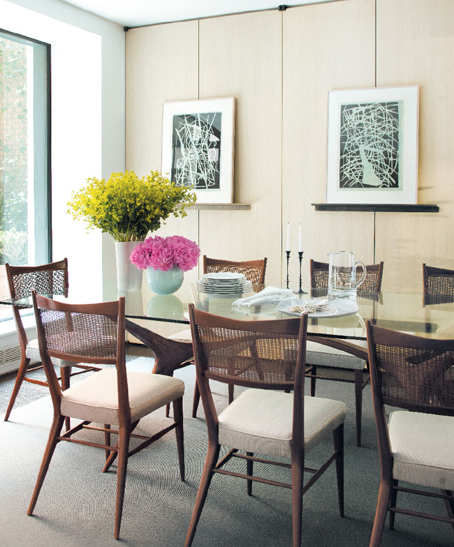 Sitting Pretty | The dining room’s Giuseppe Scapinelli table is surrounded by vintage Paul McCobb chairs reupholstered in Holly Hunt’s Ice Blue fabric.
