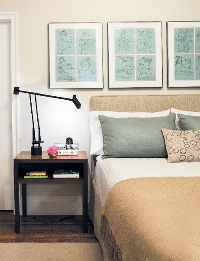 Structural Beauty | Berke designed the plain-sawn red oak night tables in the master bedroom, which features works from Andy Warhol’s xerography series. The aquamarine shams are from Holly Hunt.