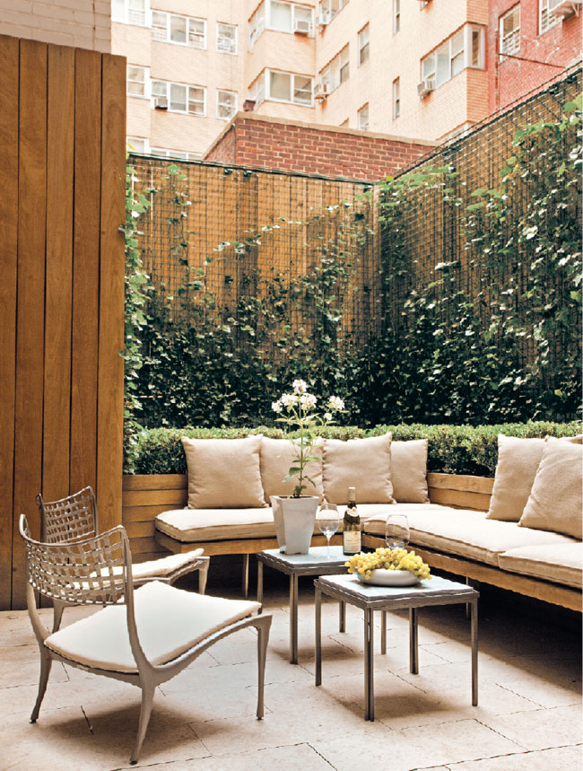 Dining By Design | The interior courtyard, a rarity in Manhattan, is decked out with an ipe wood wall, bench cushions in a Perennials Fabrics linen, and a pair of Brown Jordan side chairs.