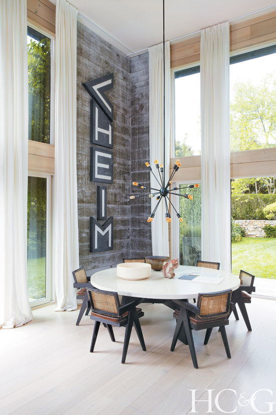 Loewen sliders link the outdoor deck to a large open kitchen and living space clad entirely in bleached white oak. “The kitchen does not scream ‘kitchen’—it was designed to disappear,” says Martin, who made everything vanish with a deceptively simple grid of storage cabinets and refrigeration units veneered in the same white oak. “John is drawn to textures and shapes, and the kitchen reflects that. It’s very sculptural—from the cabinets to the stainless-steel range hood to the gray concrete countertop.” The bathroom counters, as well as the massive white dining table—a copy of a smaller Pierre Jeanneret original from the 1950s—are also made of concrete. Providing a stunning vertical exclamation point on the wall behind the latter is yet another nod to Cheim’s past: a sign spelling cheim, which comes from the early-1950s office of his paternal grandfather, Cheim Lumber founder Leo Cheim.