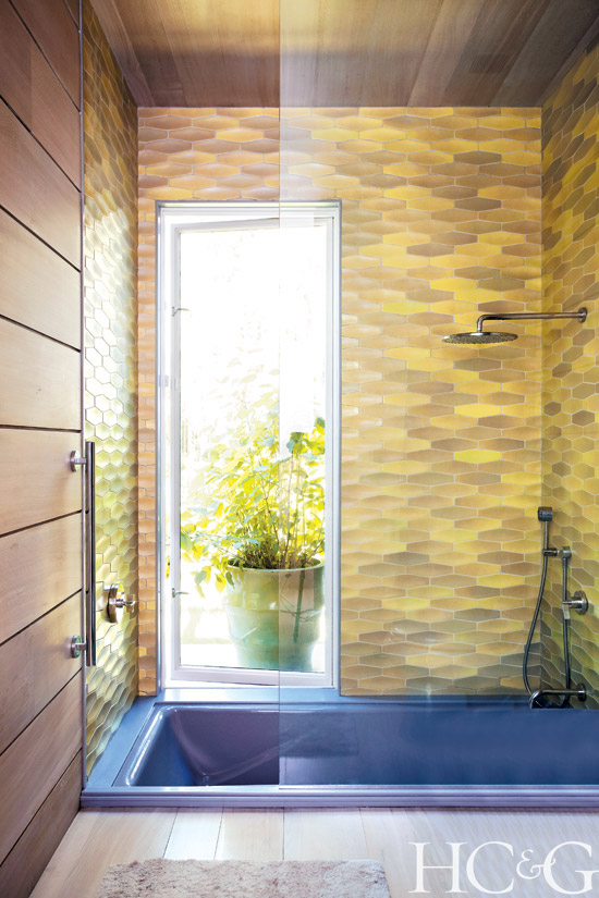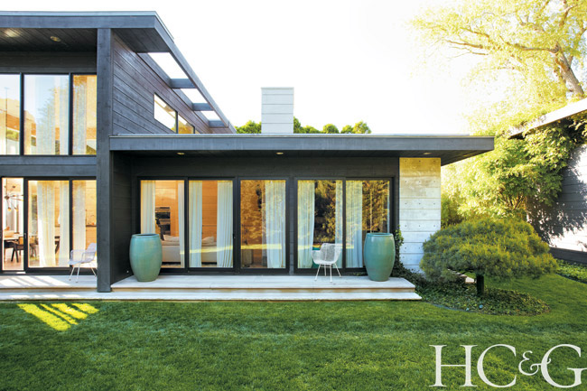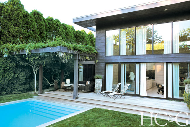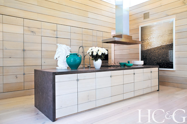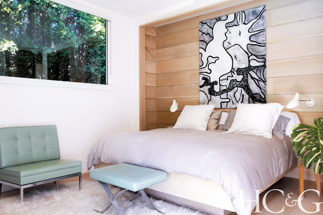 For inspiration, Cheim looked to his family and his California roots. “In the 1920s, my grandmother, Anne Oliver, a designer for San Francisco’s then-fashionable Gump’s department store, had a beautiful home made of lava stone and rough-sawn cedar planks, along with goldfish ponds, enormous pine trees, and California pottery,” he says. “I wanted a simple house, continuous in color and material, that was harmonious with nature. Most of the artists we work with in the gallery—Joan Mitchell, Louise Fishman, Lynda Benglis, and Pat Steir, among others—have a sensitivity to nature and incorporate its beauty into their work, and the house reflects that.” Not just the materials but their hues follow this dictum, with exteriors stained “the color of wet bark after a rain, and the interior walls the color of light on sand.” Situated in the middle of the yard, the house appears as if it has been plopped into a sophisticated nature sanctuary, with abundant glass windows and doors achieving the desired indoor/outdoor effect.