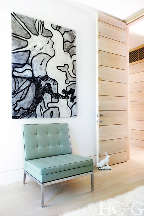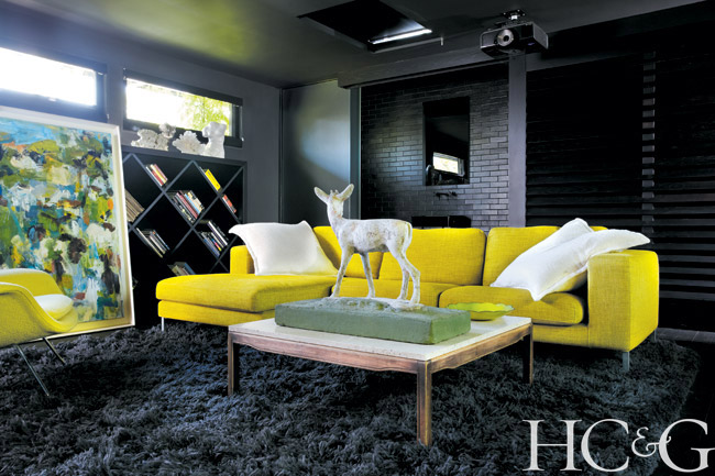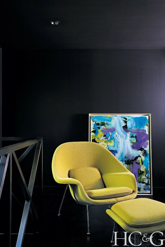 Offering a change of pace from the main house—and a slightly less bucolic form of escape—is the film and music room above the garage, a self-contained sanctuary/den/screening room/man cave with inky black walls, blackout window shades, and sliding doors that conceal a bar and bath. Two colorful canvases by contemporary Hamptons artist Robert Harms, a Saarinen Womb armchair, and a green linen sofa from Design Within Reach add intriguing layers to the mod mystique.