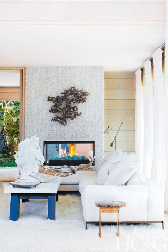 On the far end of the living area, an intimate sitting room beckons with a stone-lined fireplace wall, a sculpture by Gloria Benedetti Seneres, and a gas-flame fireplace filled with luminous aqua glass crystals. Three small but airy bedrooms are tucked in discreet corners off the main public space, all offering garden access. In addition to the pool’s peaceful sitting area and pergola with cascading white wisteria, a serene vanishing-edge meditation pond, abundant with water lilies, provides further quietude and reflective escape.