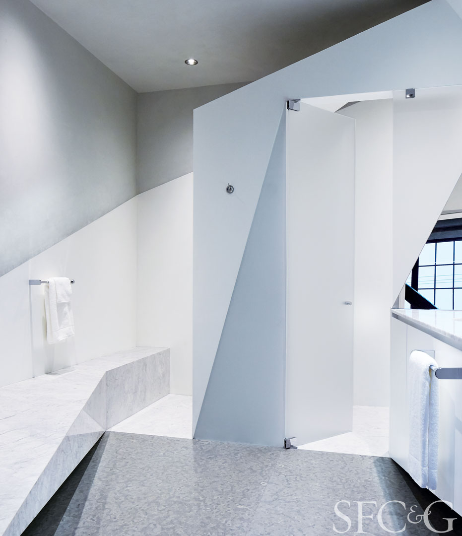 The master bathroom features a custom bench in PietraFina marble.