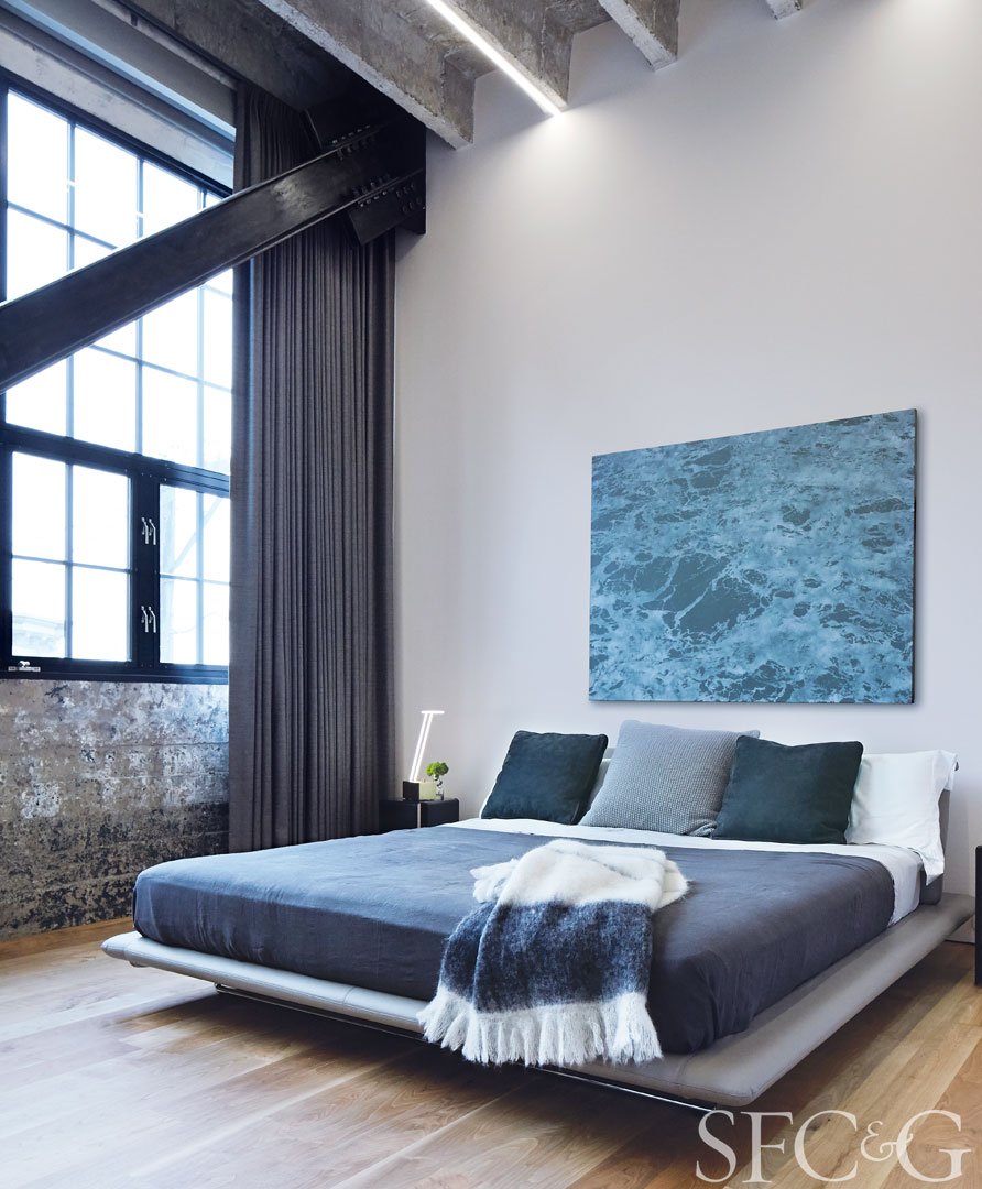 Siena bed is by Naoto Fukasawa for B&B Italia. Bedding and throw are through Jessie Black. Black Baltic bedside table is through Coup d’Etat, and neon Light Line table lamp is through the Future Perfect. Artwork above bed is Benjamin Guffee’s Churning 03.